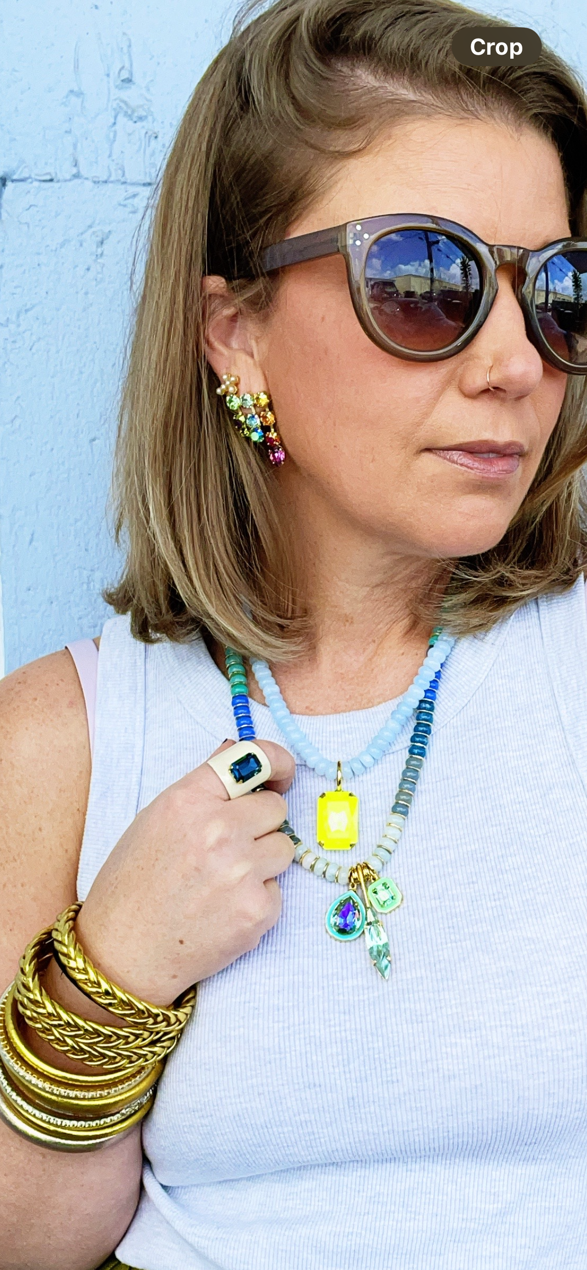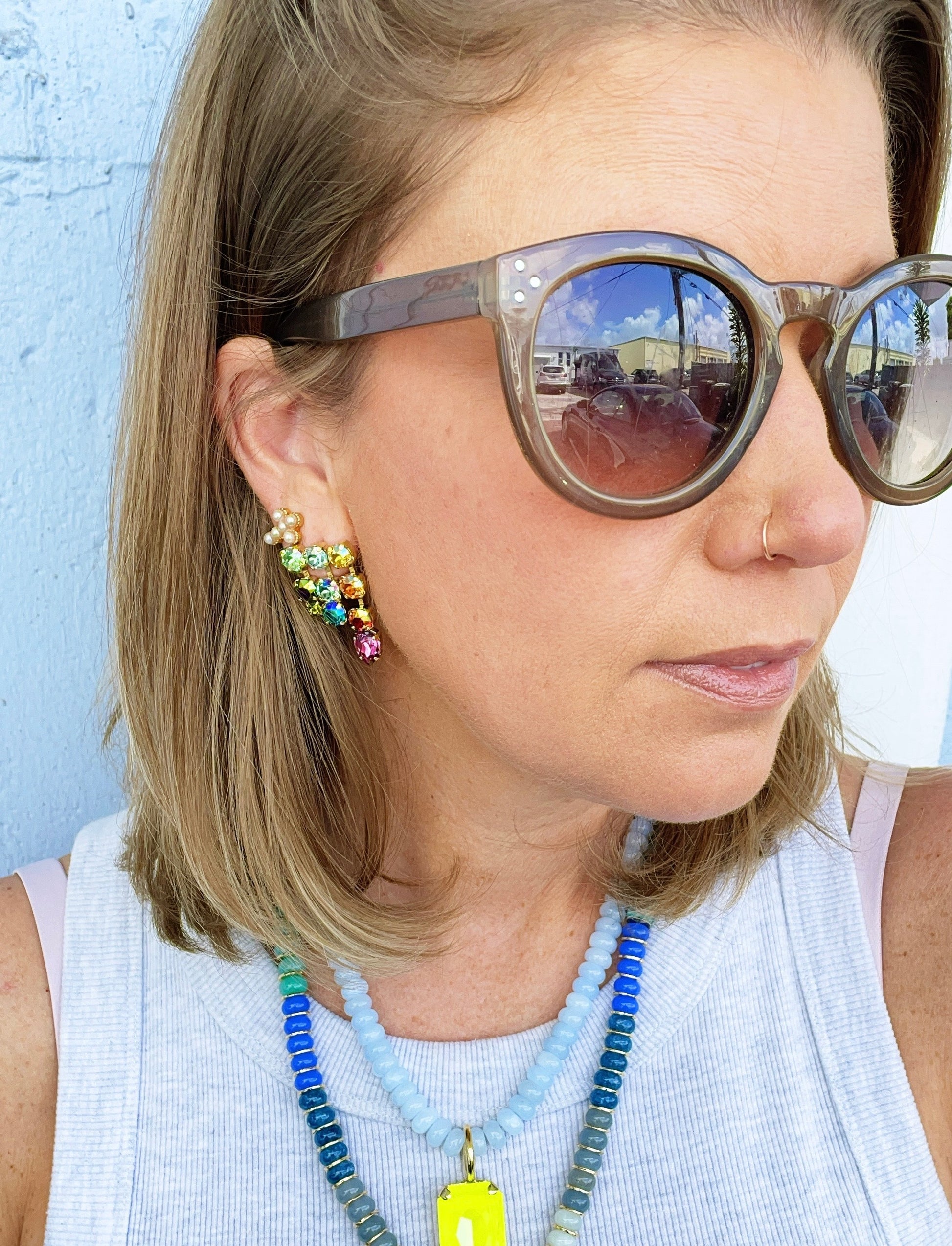 Add a touch of antique elegance with our Dara Earrings. These 1.25" long earrings are crafted with high quality crystals on an antique Gold plated brass base. Hypoallergenic surgical steel posts ensure comfortable wear. Made in Canada.