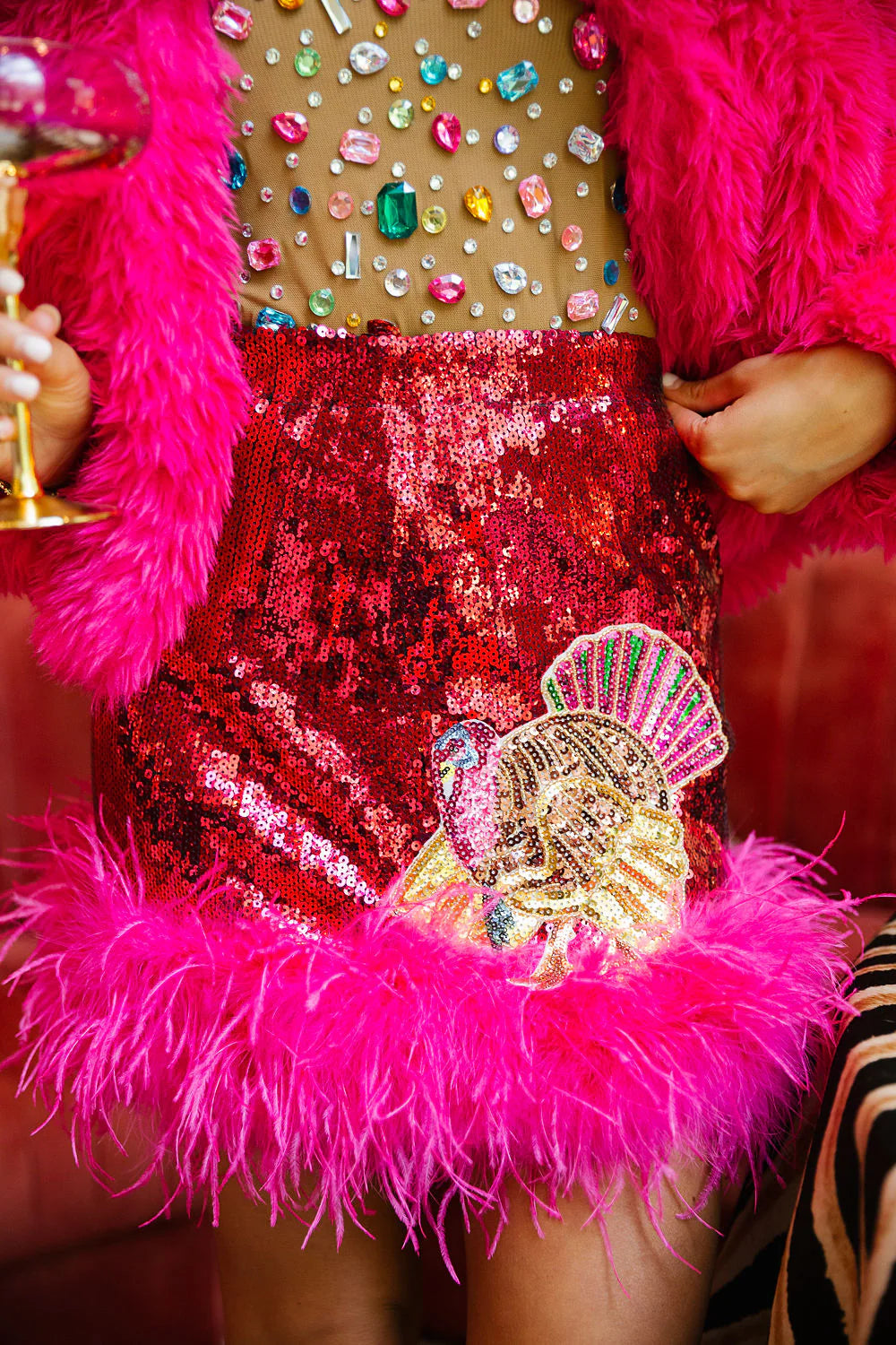 Turn heads with the Turkey Sequin Feather Skirt, featuring shimmering pink sequins and a playful sequin turkey patch. Accented with delicate feathers around the bottom, this skirt combines festive sparkle with flirty texture, making it the perfect statement piece for holiday celebrations.