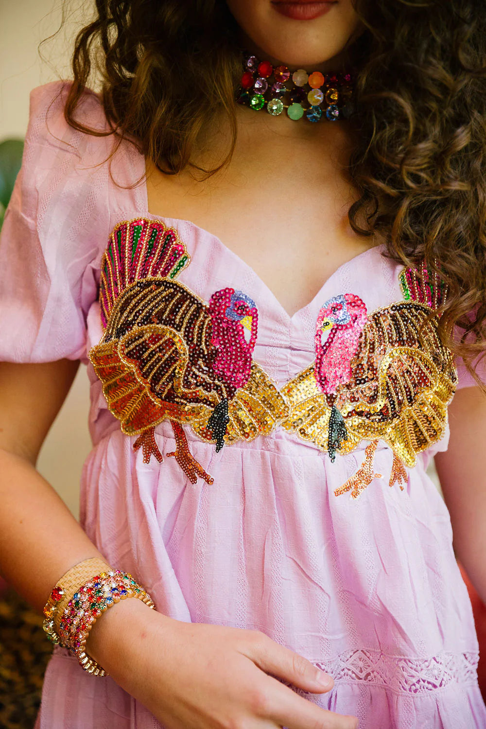 Step into festive elegance with the Gobble Glam Lavender Dress. This charming babydoll silhouette features a soft lavender hue complemented by a sparkling sequin turkey patch, adding a playful yet glamorous touch. Perfect for holiday celebrations, it combines comfort and style to help you stand out with effortless grace.