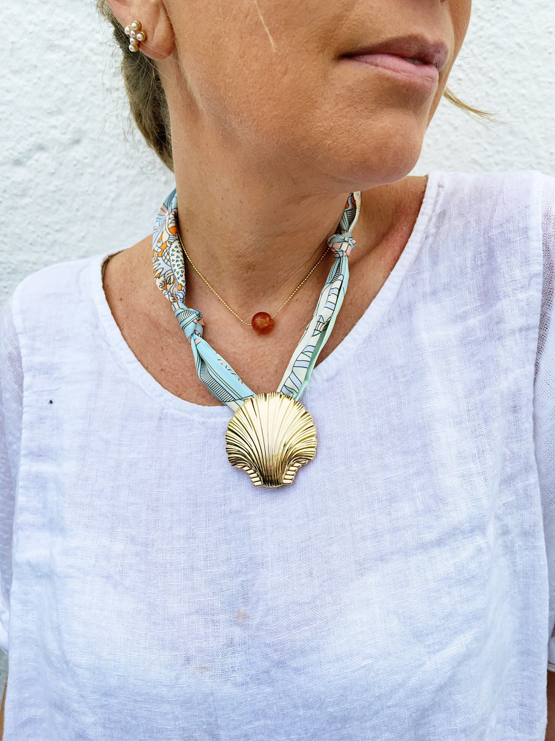 shell pendant on thin scarf can be removed and worn as a scarf broach