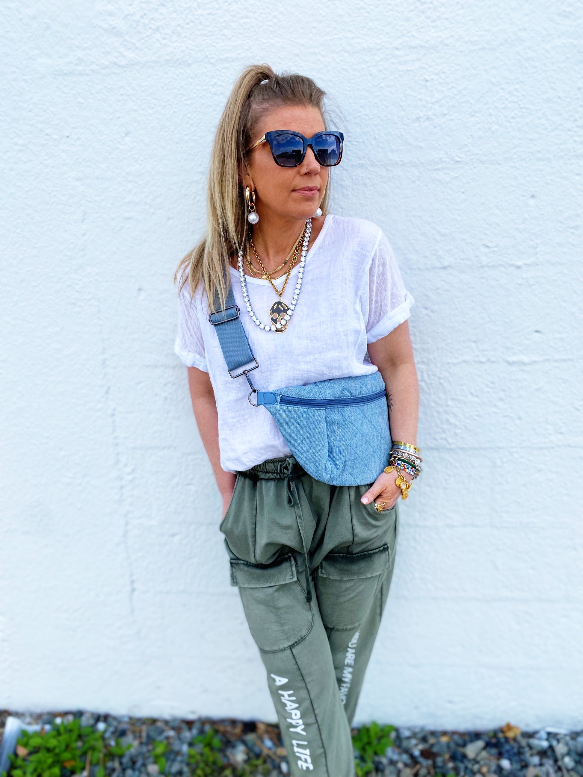 - Quilted denim sling bag featuring top entry and additional back zip pocket. Sling strap adjustable to 40 inches.