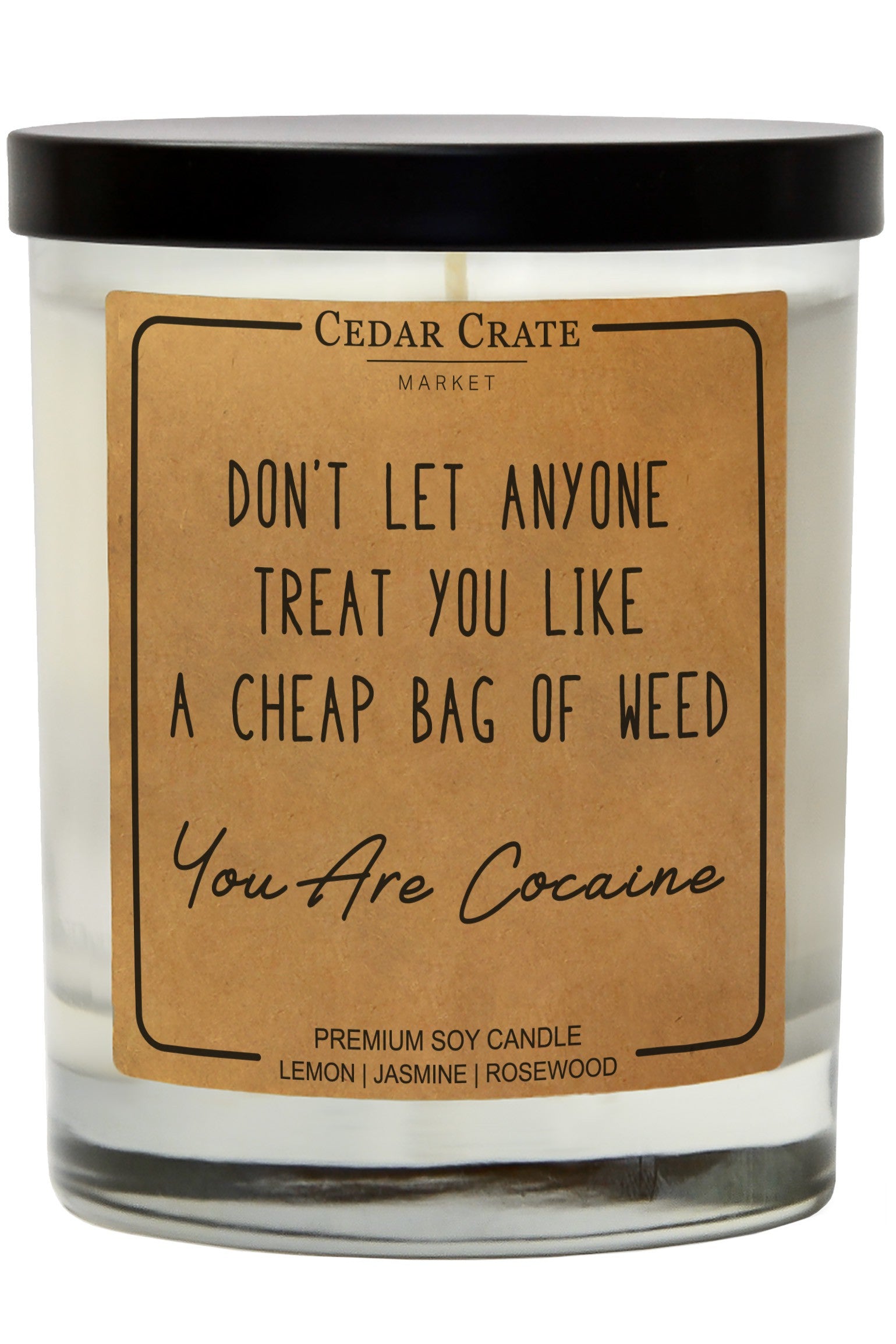 Overview: "Don't Let Anyone Treat You Like A Cheap Bag Of Weed You Are Coacaine" Lemon, Jasime, Rosewood Candle in a 14 ounce reusable glass container with chrome lid. A Fill Weight: 10 ounces. 100% All-Natural Soy Candle Hand Poured In Small Batches. Cotton With Paper Core Wick That Is Zinc And Lead Free.