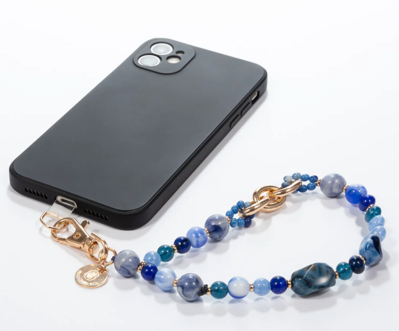 Phone Wristlet featuring Assorted Acrylic/Glass/Stone Beads with 14K Gold Plated Links. Turn your phone into a wearable accessory that keeps you hands-free... think of it as a bracelet for your cell phone!
