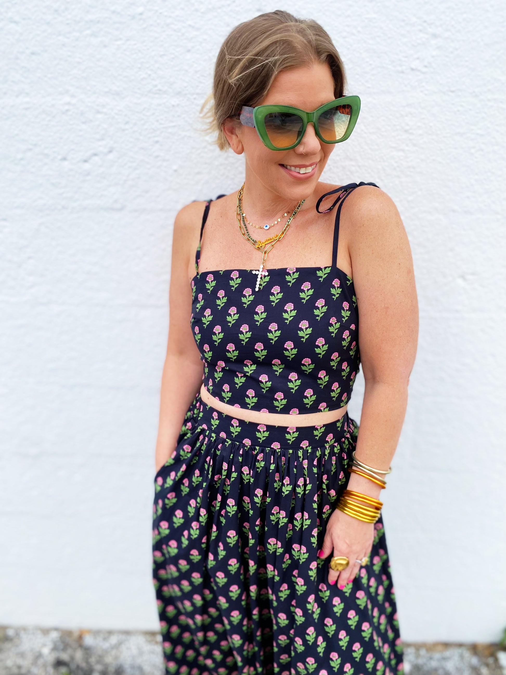 This floral crop top and skirt set is a delightful choice for a feminine and playful outfit. The charming floral pattern adds a touch of whimsy to the ensemble, perfect for a sunny day out. Elevate your style with this coordinated set that exudes a fun and vibrant vibe.