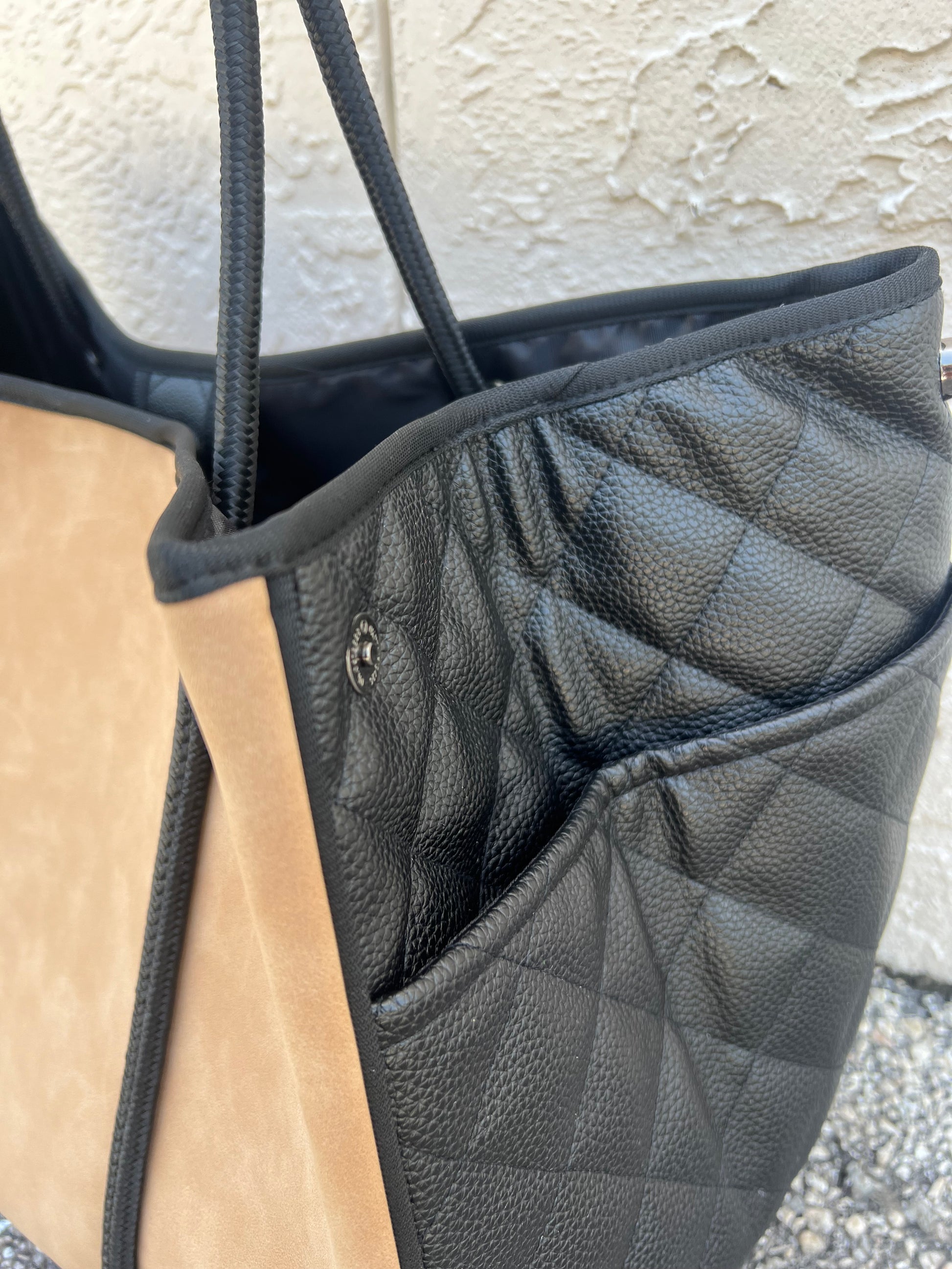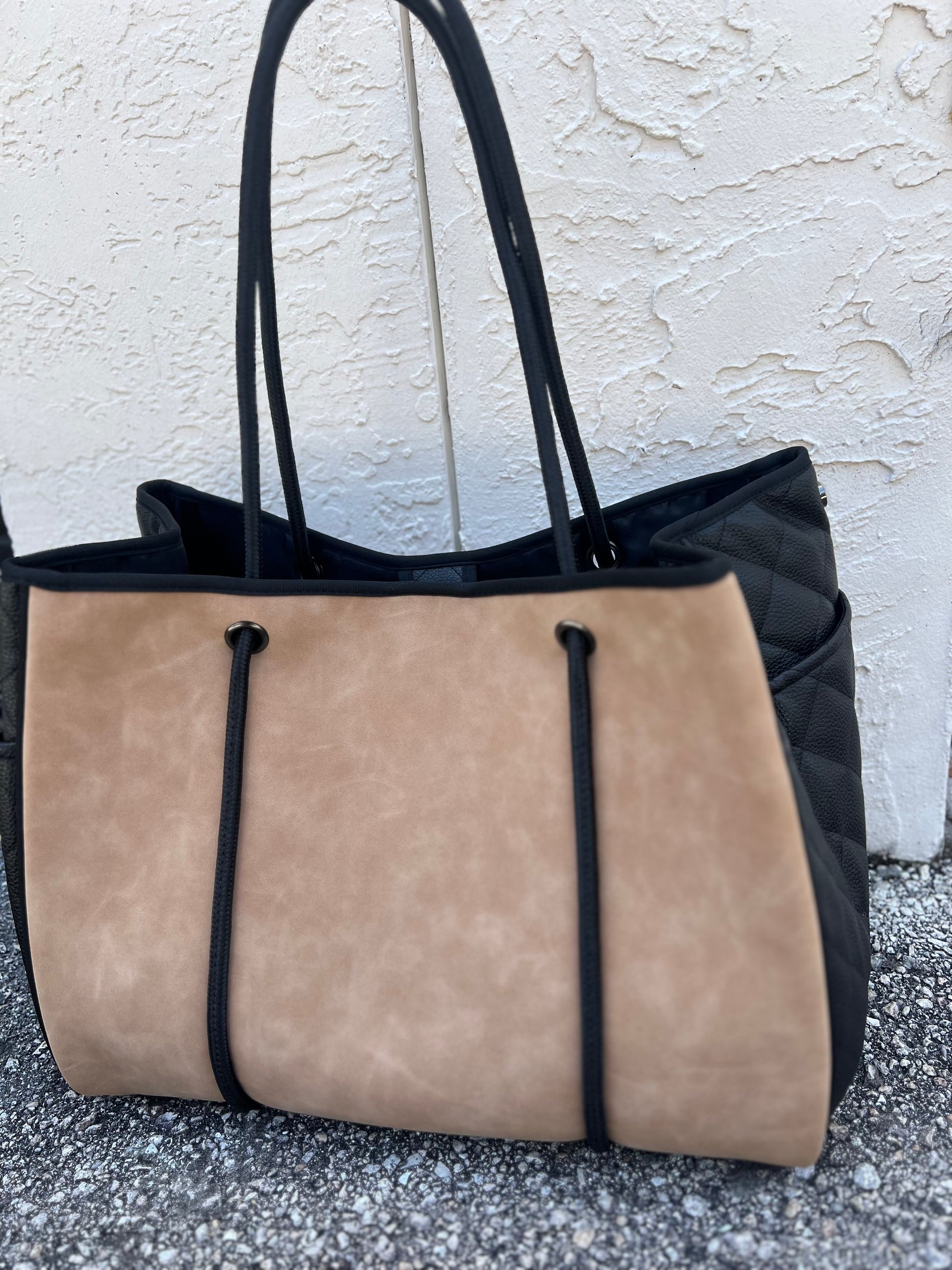 camel vegan suede quilted black vegan leather sides