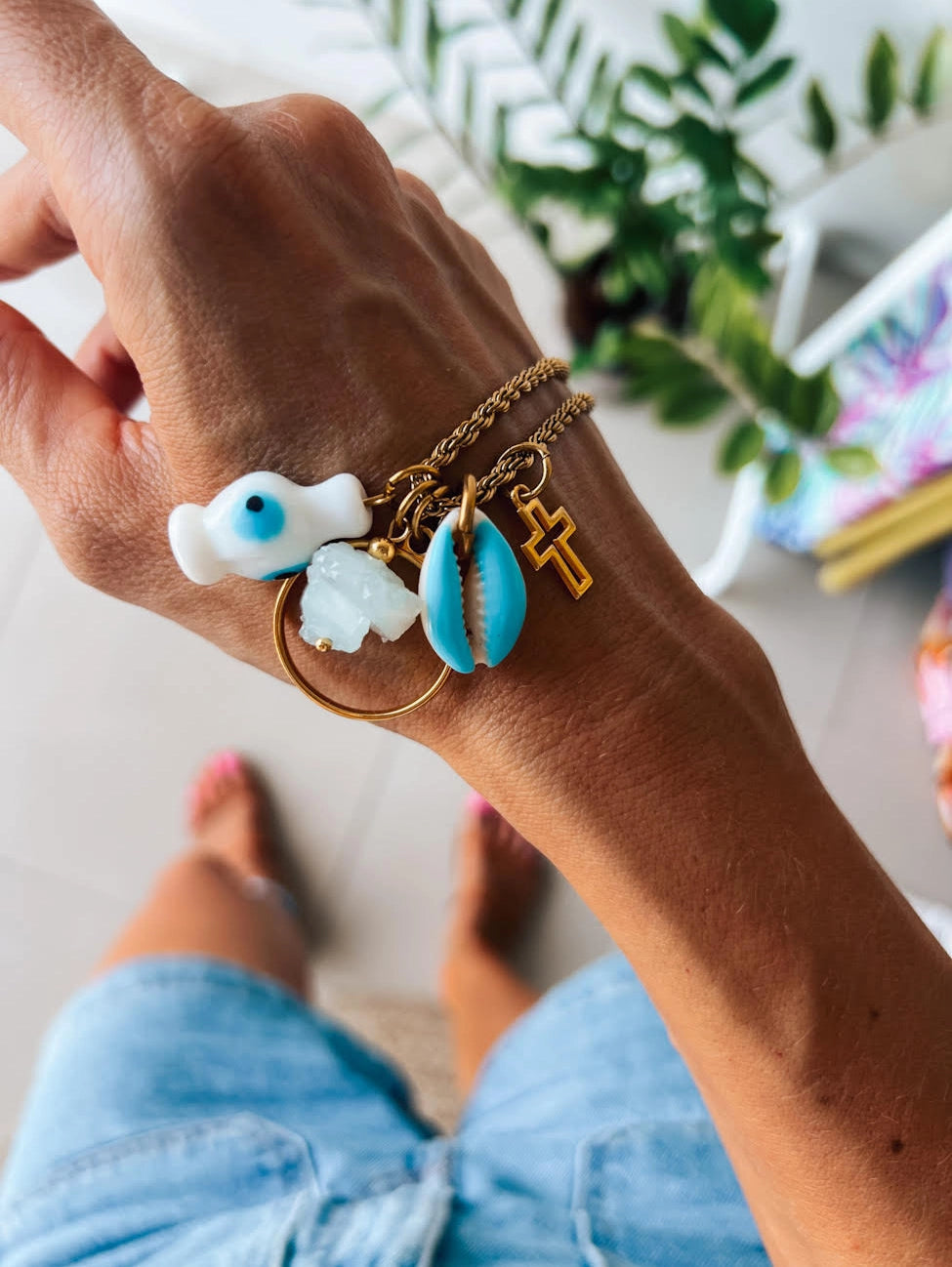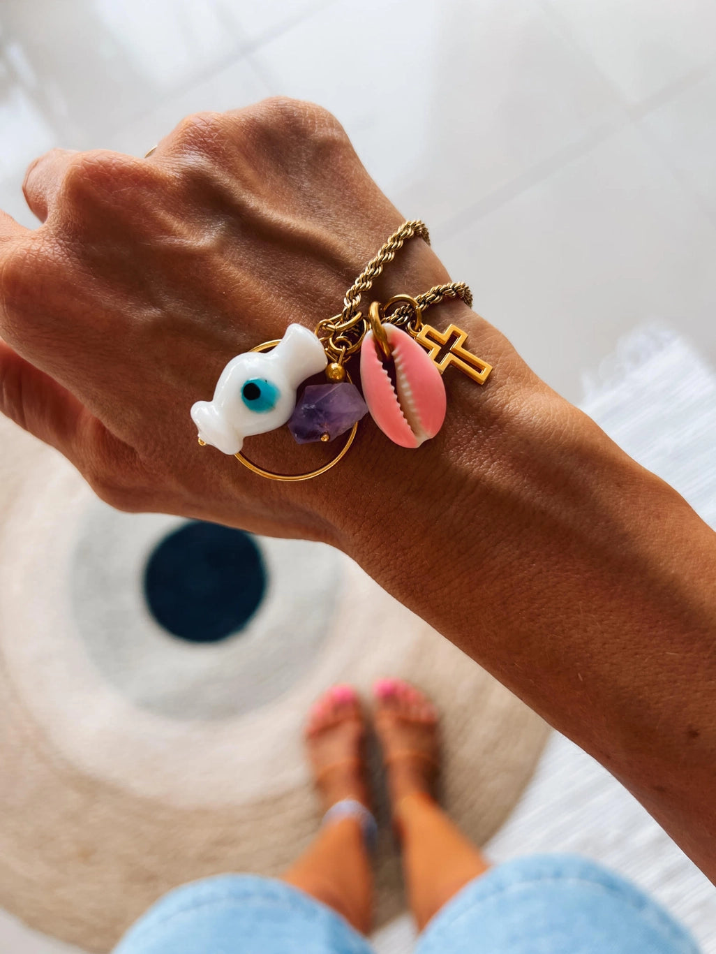 made in Greece - Gold steel chain Goldplated copper parts Shells, semiprecious stones 72cm long