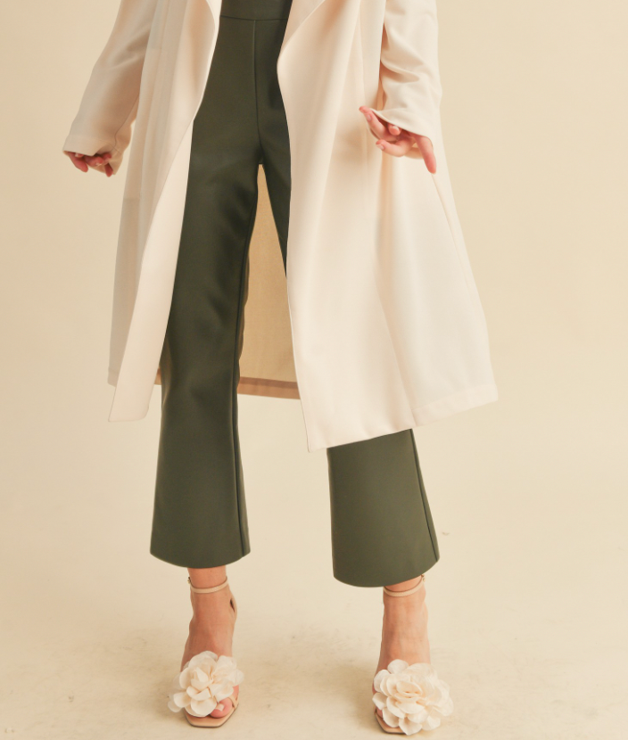 Sophistication at her finest, look sleek in this vegan leather pant featuring a high-rise, flare silhouette with front slit feature for added dimension.
