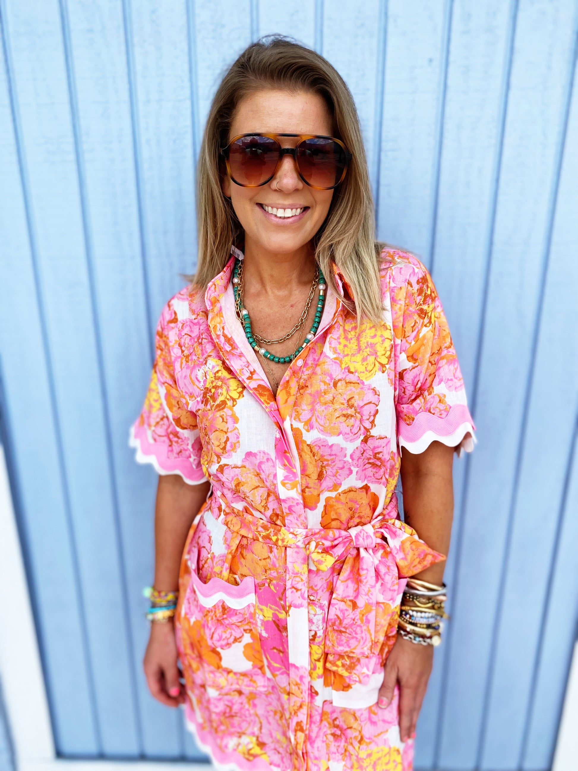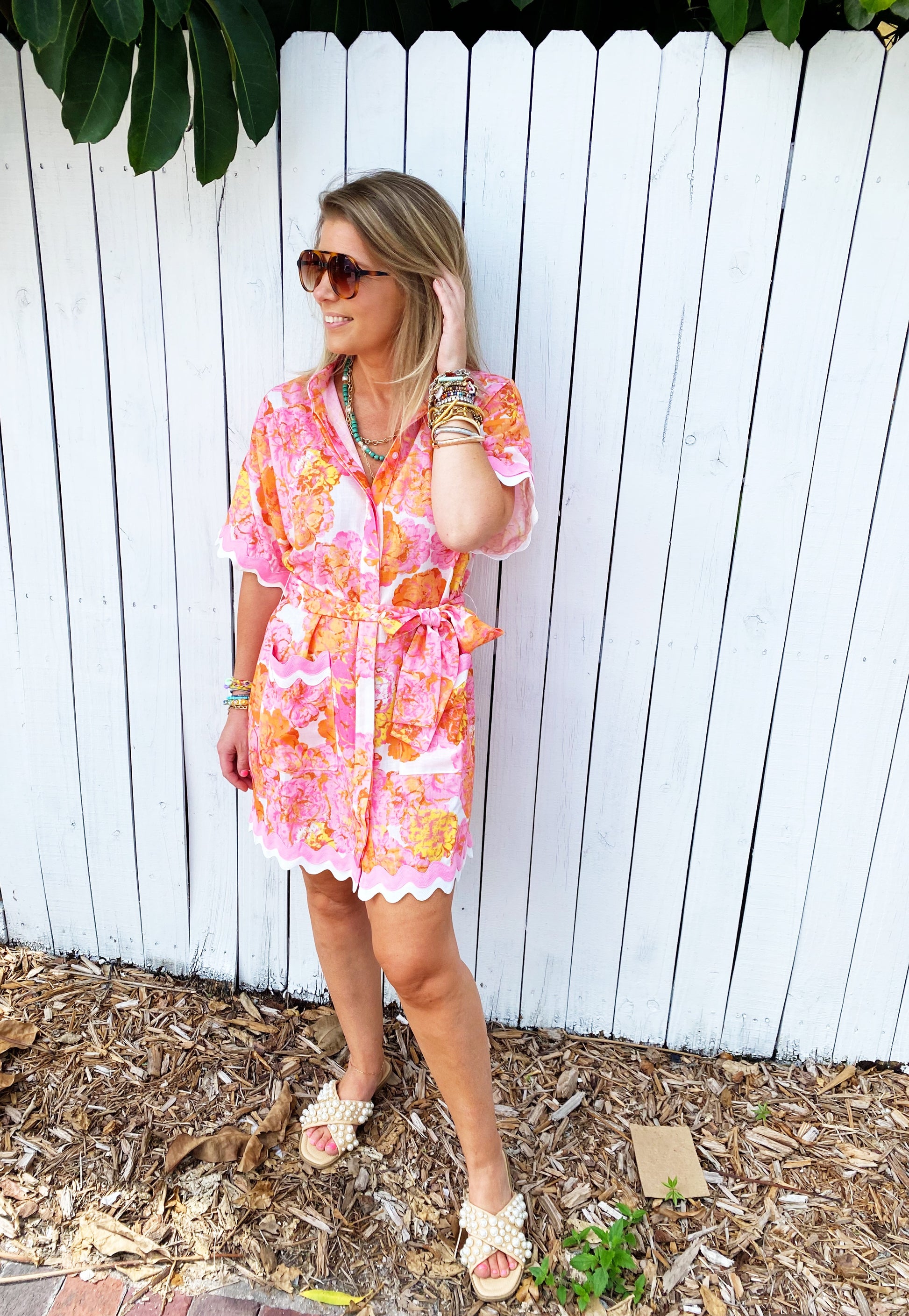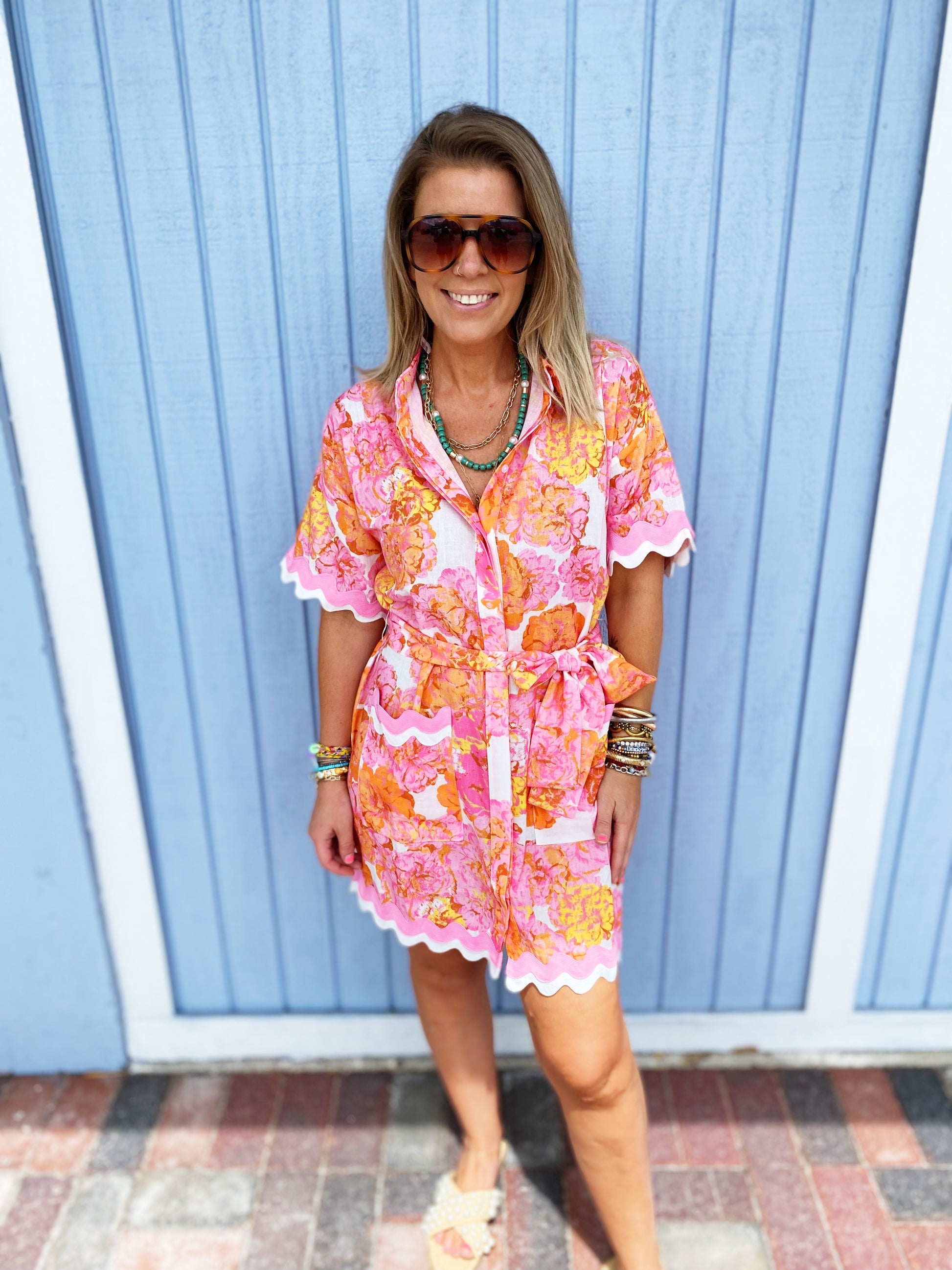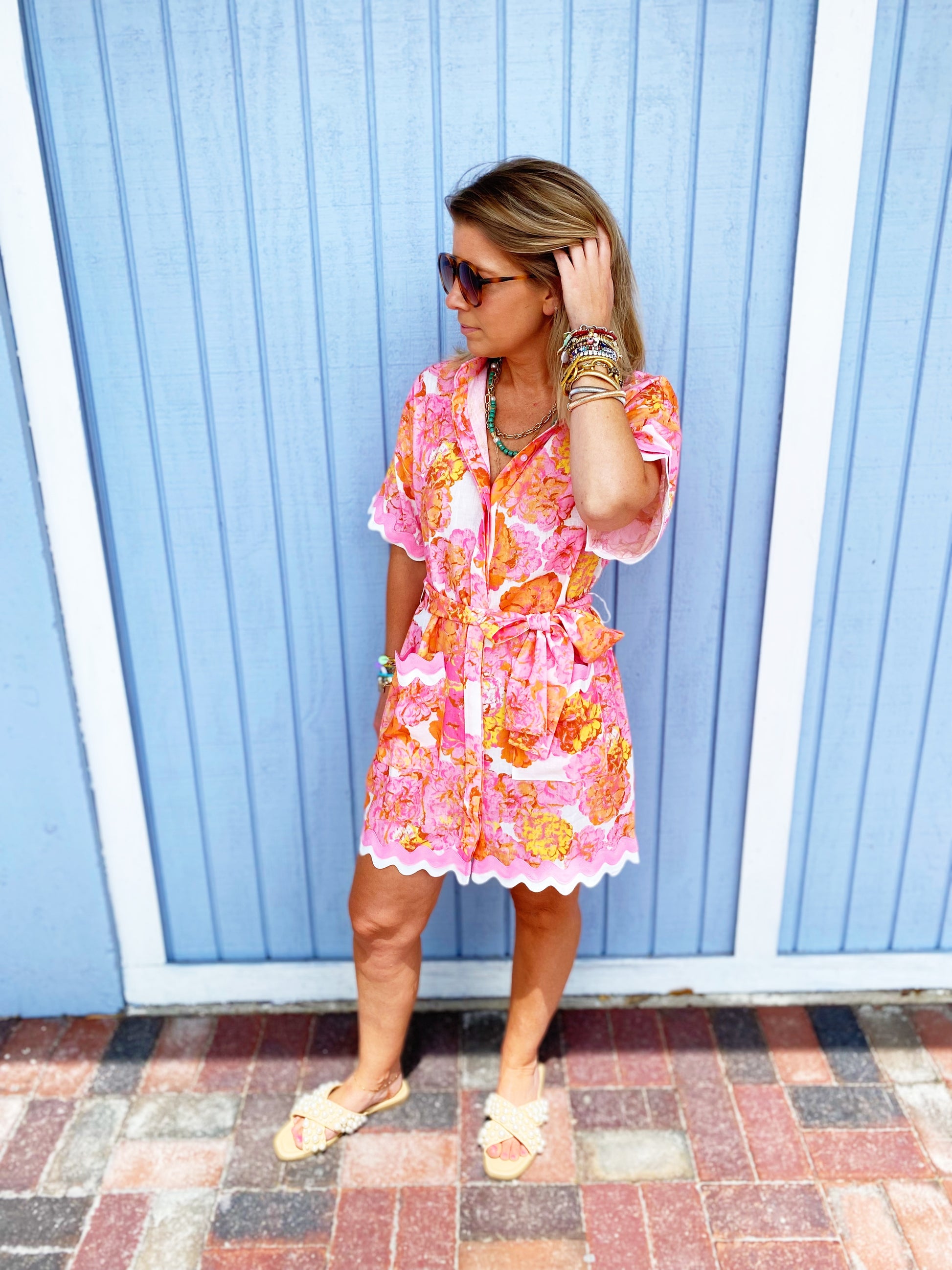 Introducing a stunning mini dress that is perfect for any of your upcoming occasions. This dress features a belted waistline, which is designed to accentuate your curves beautifully. The button-down front adds a touch of sophistication, while the short sleeves and V-neckline make it comfortable and breathable. The dress also boasts a delightful color block wave trim, which adds a unique touch to the overall design.