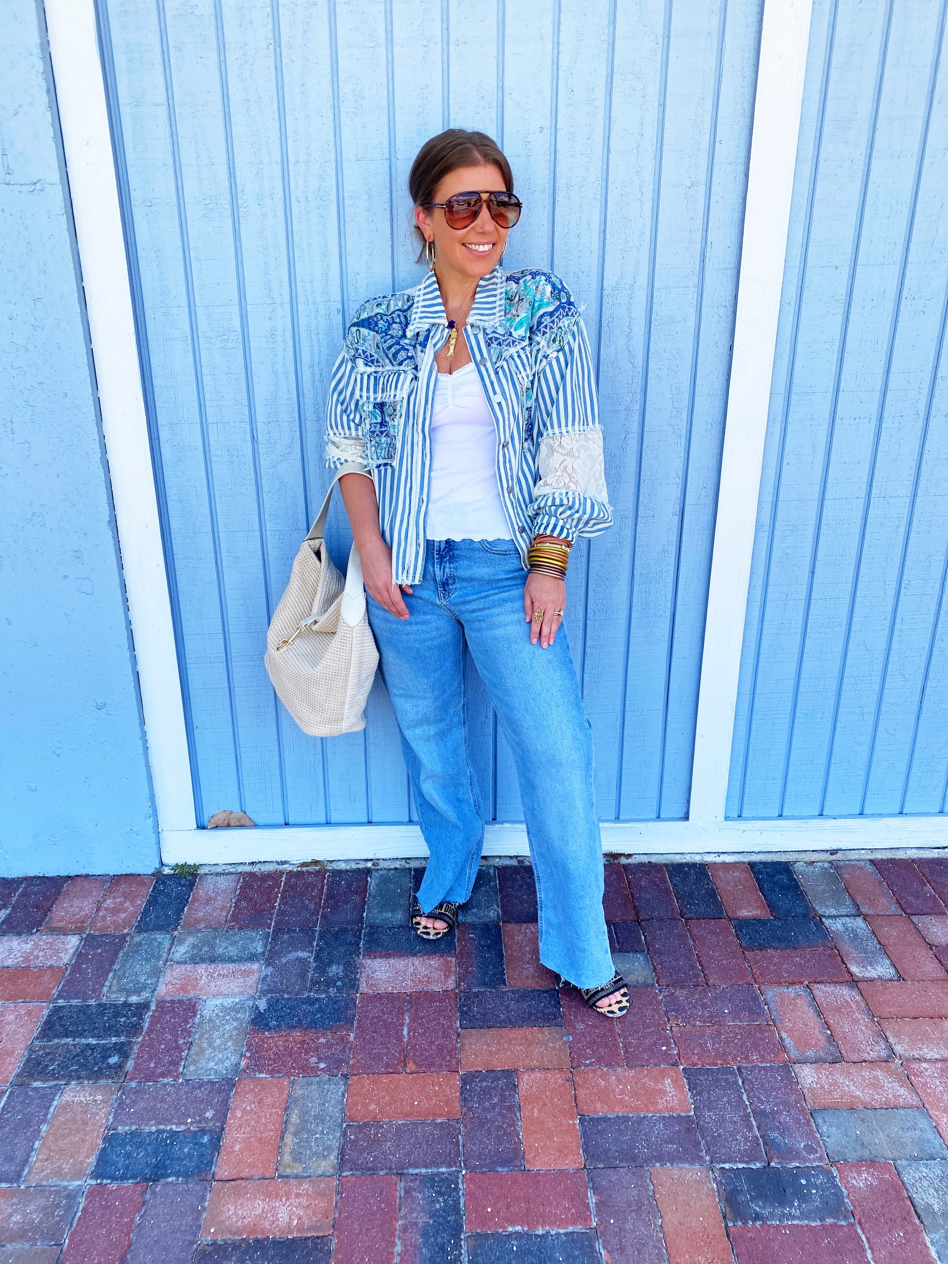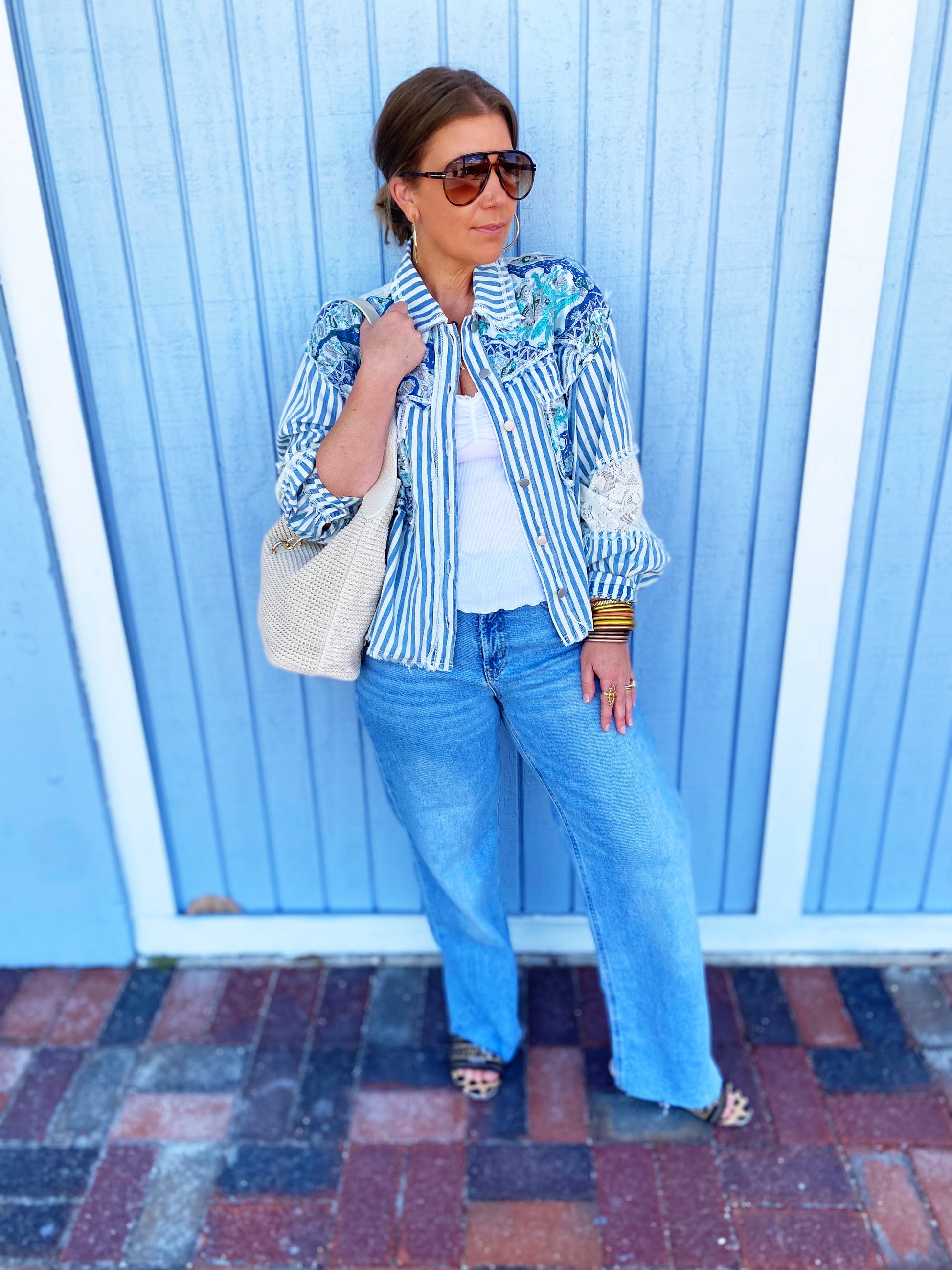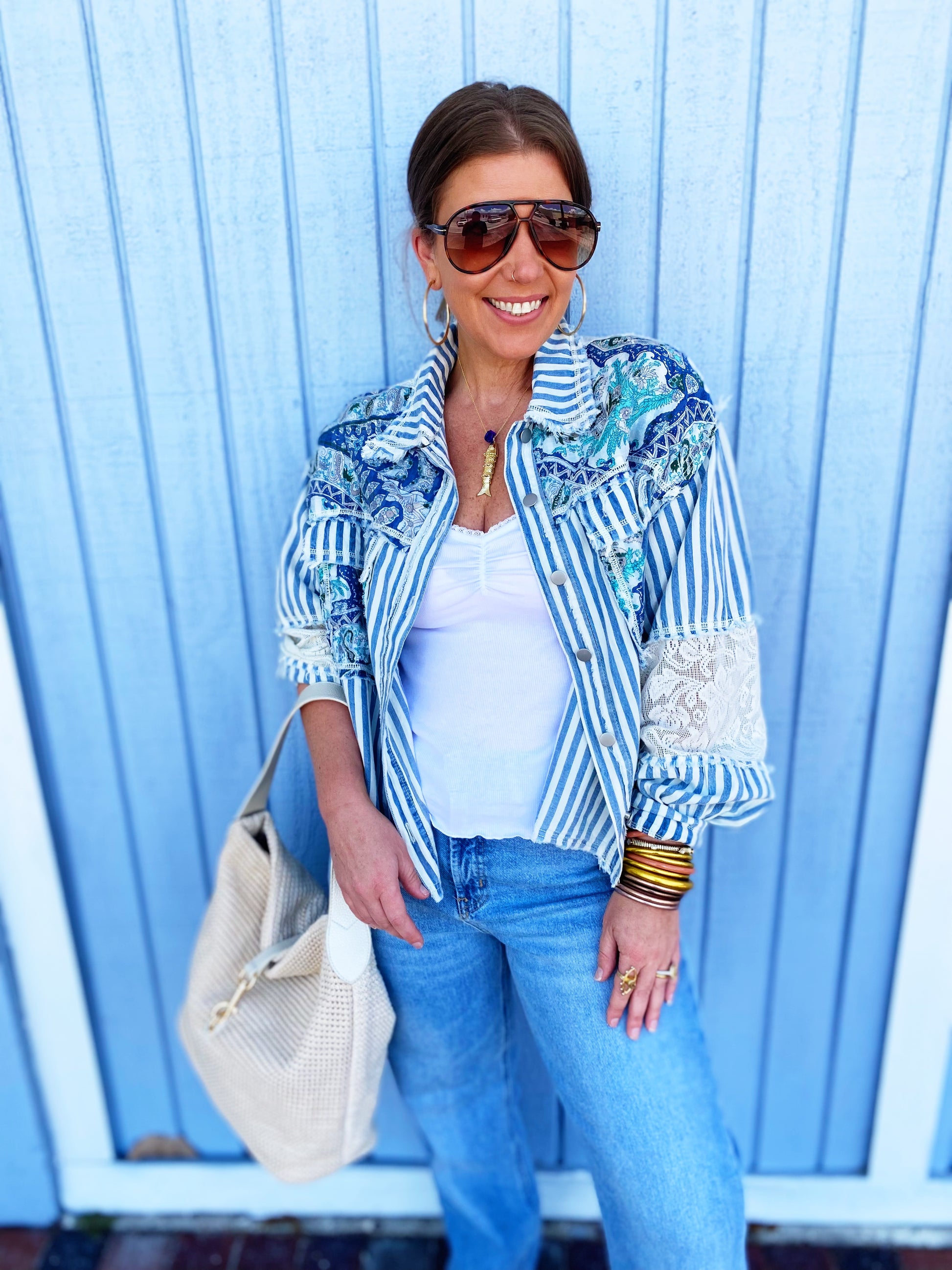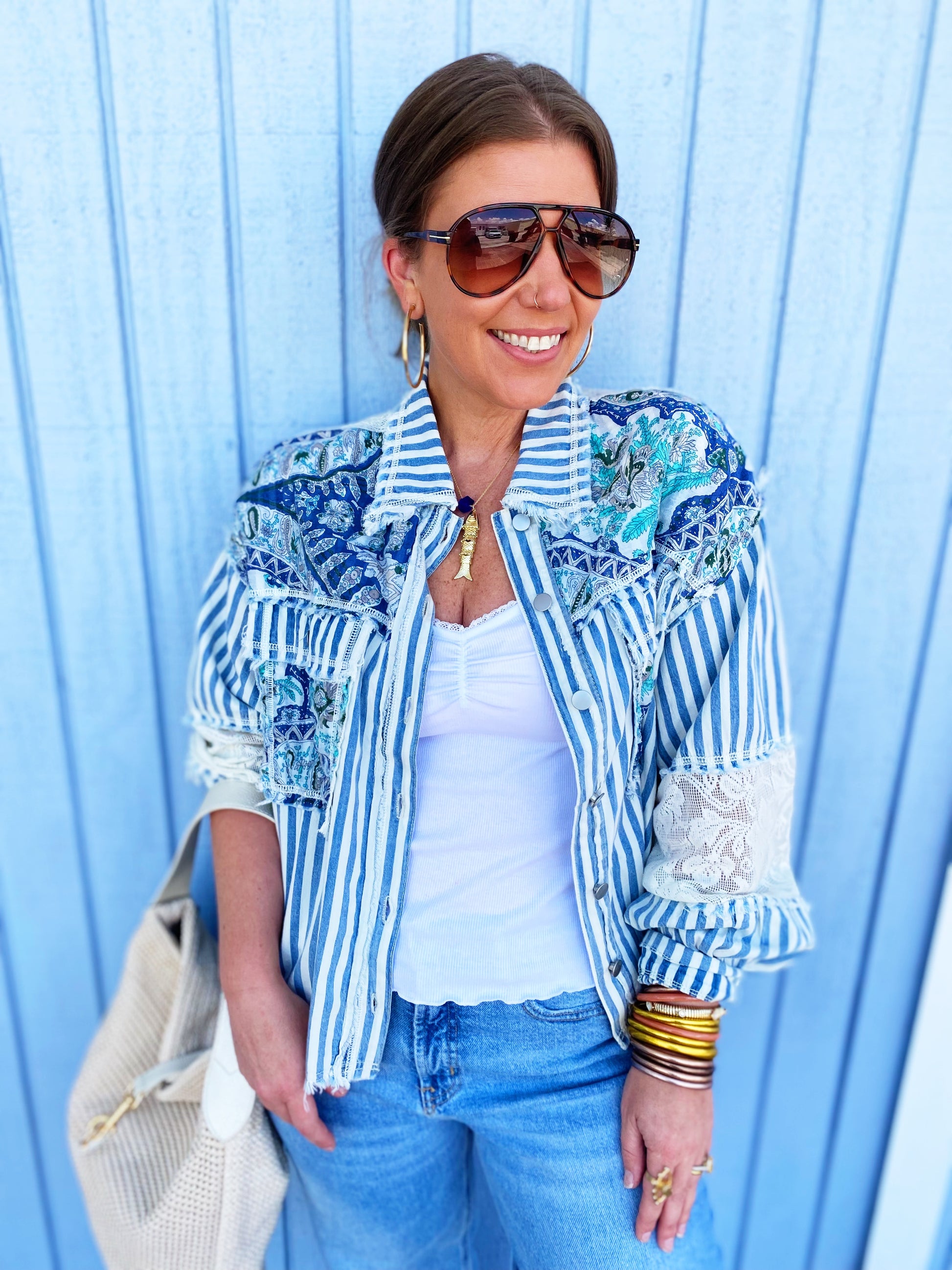 This stunning bohemian-inspired jacket features a unique patchwork design combining blue and white stripes with paisley prints and delicate lace trim details. Crafted from lightweight fabric, it offers a relaxed oversized fit perfect for layering. The button-front closure and long sleeves provide versatile styling options, while the mixed print aesthetic creates a distinctive boho-chic look. Ideal for casual wear, this jacket combines contemporary fashion with vintage-inspired elements, making it a standout piece for the modern wardrobe.