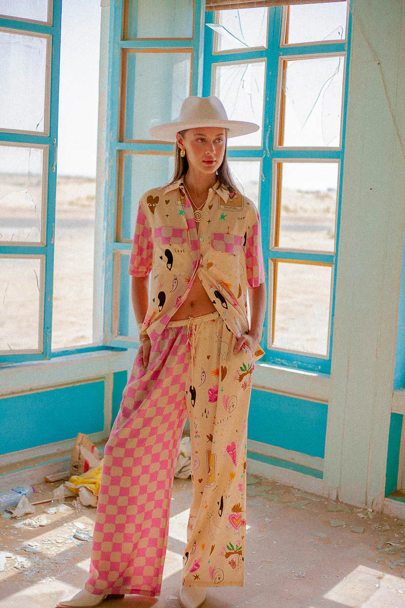 Introducing our Lovers pants in eco rayon, featuring our valentines print with spliced pink and cream check, a relaxed easy fit, elastic waistband and draw cord.
