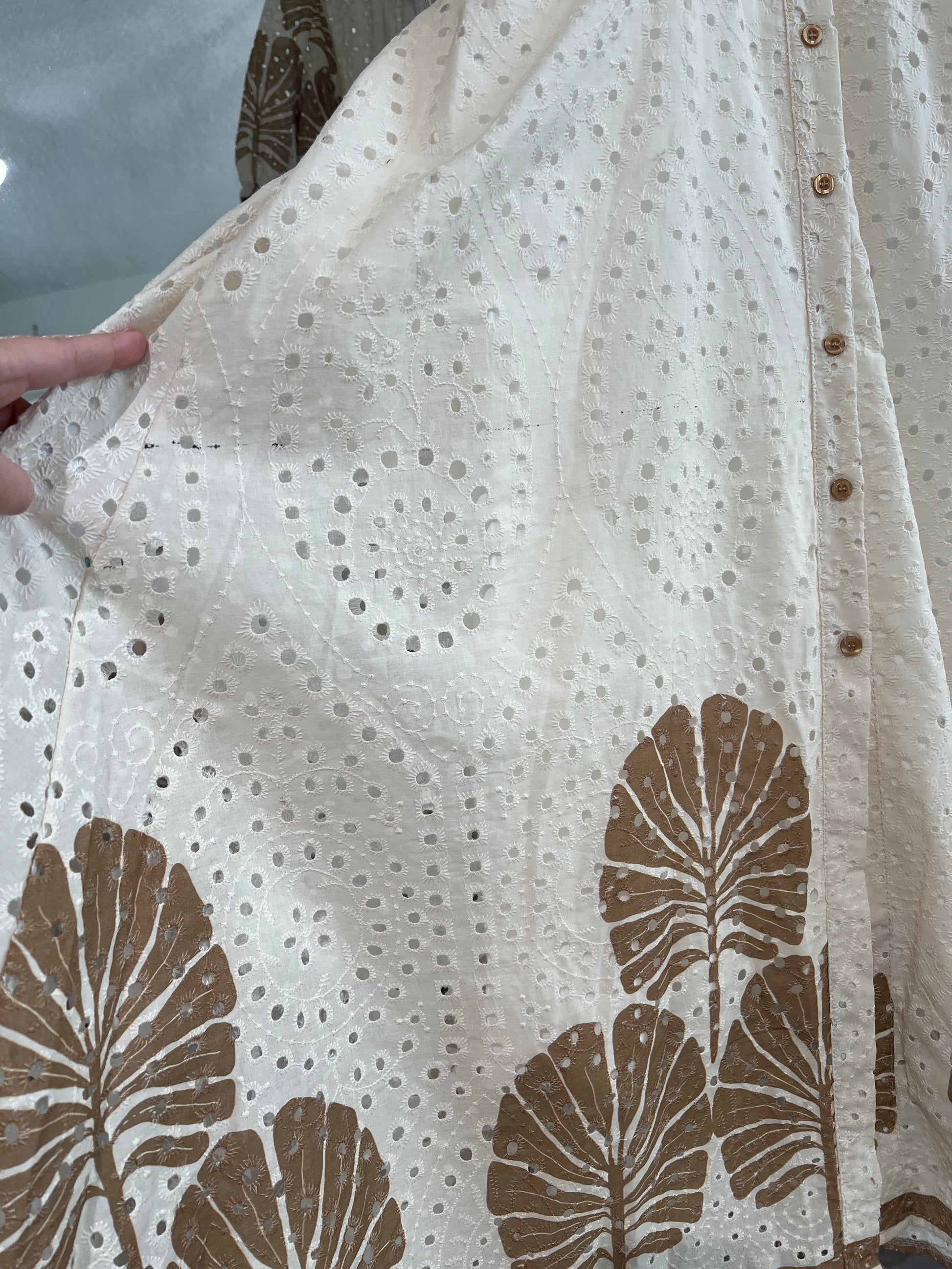 This playful one-size dress features delicate eyelit fabric accented with navy piping and comes with a stylish belt to cinch your waist perfectly.