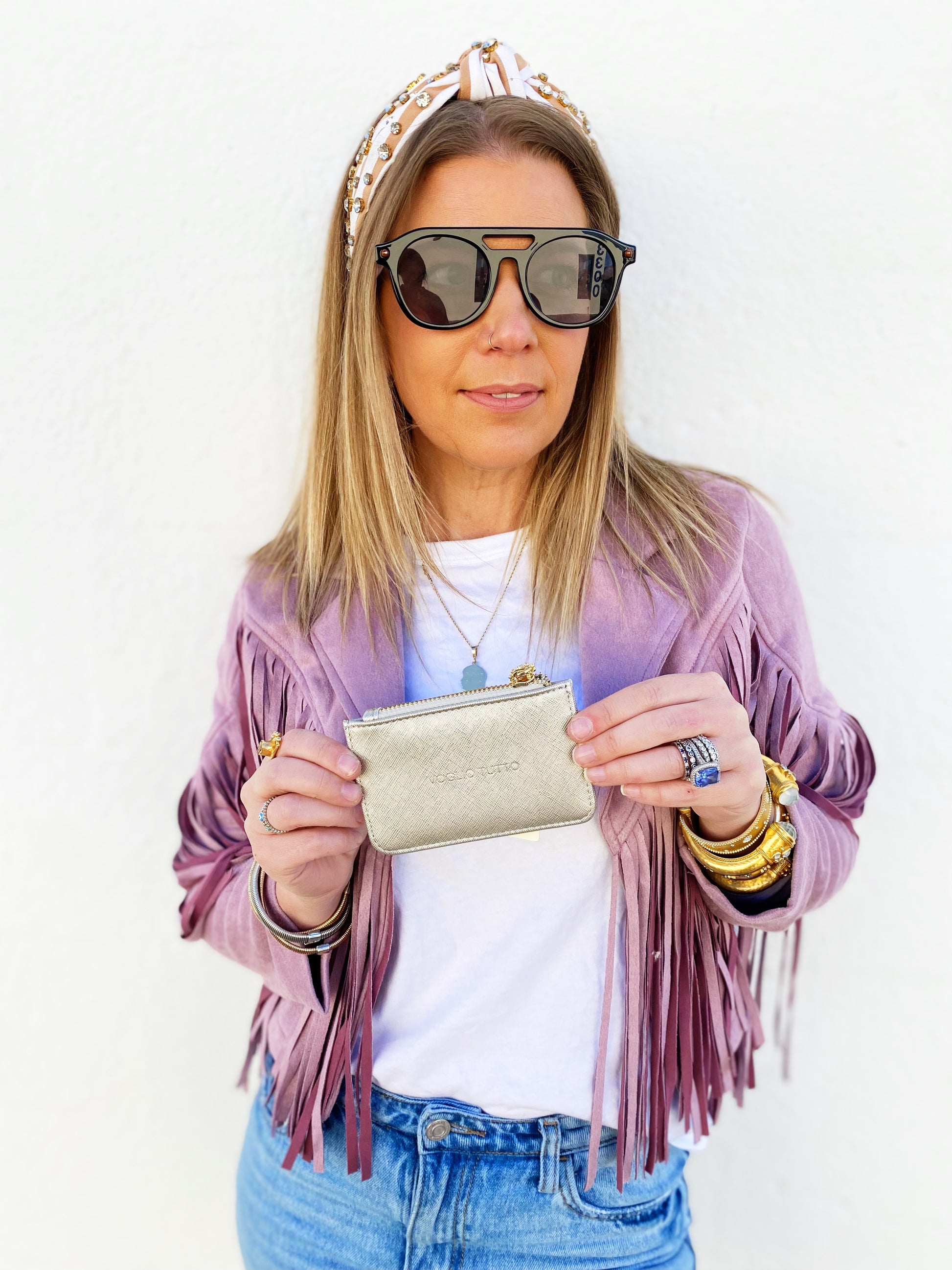 - Golden tone puller + zipper