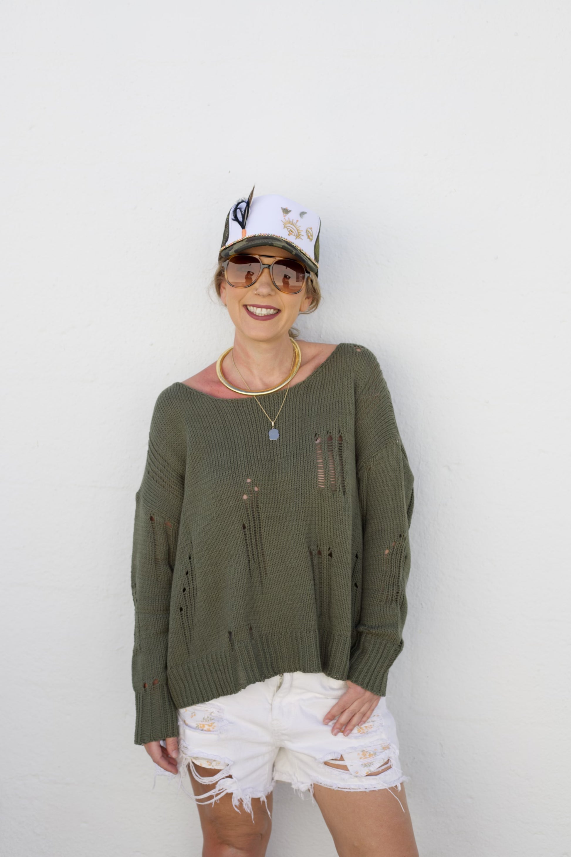 Solid long sleeve sweater top featuring distressing going throughout, a boat neckline for a cold shoulder effect if desired, a ribbed bottom band and ribbed cuffs.