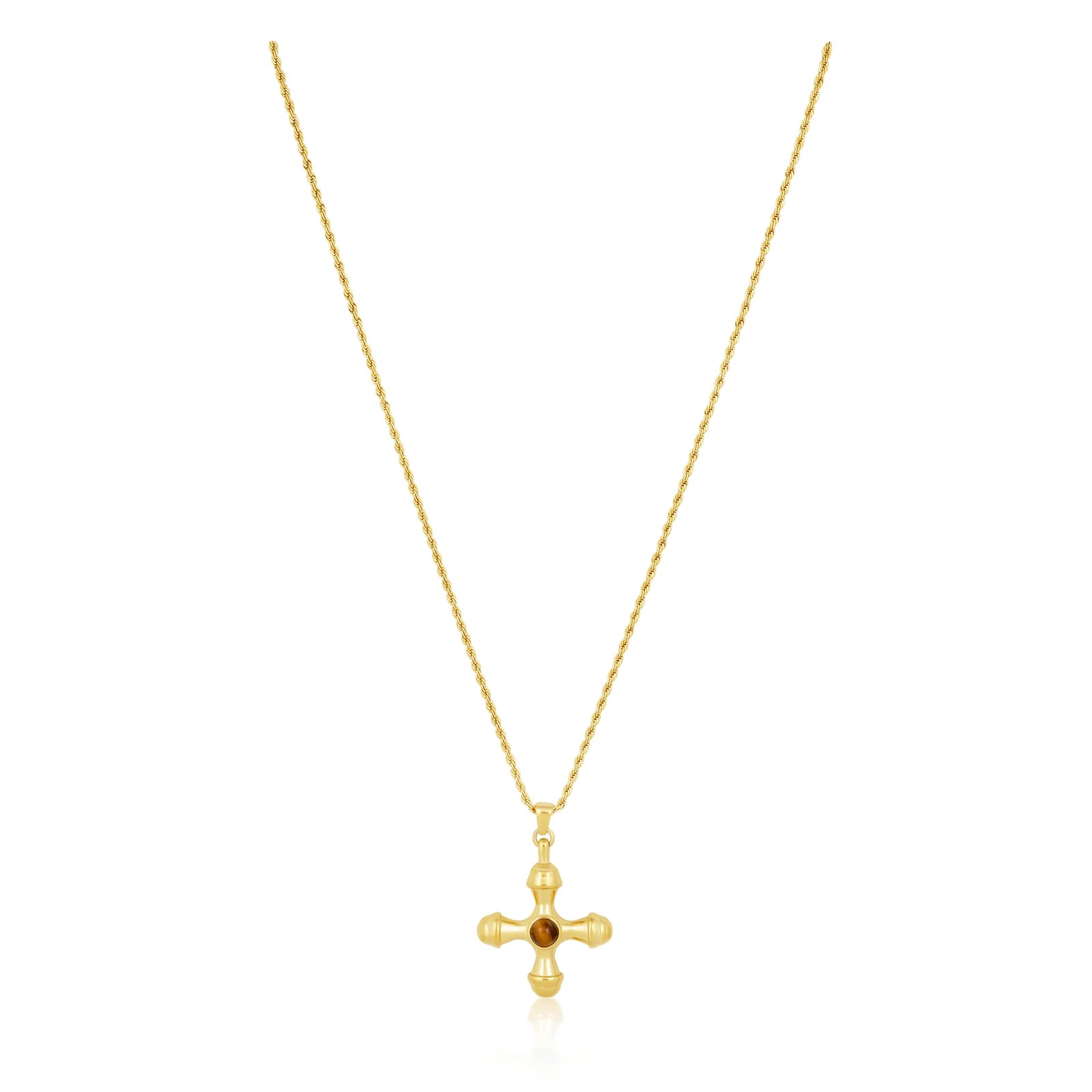 Unleash your inner strength with the Ophelia Cross Necklace. This stunning necklace features a Tiger Eye Stone cross, symbolizing courage and protection. Elevate your style and feel empowered with this unique and meaningful accessory.