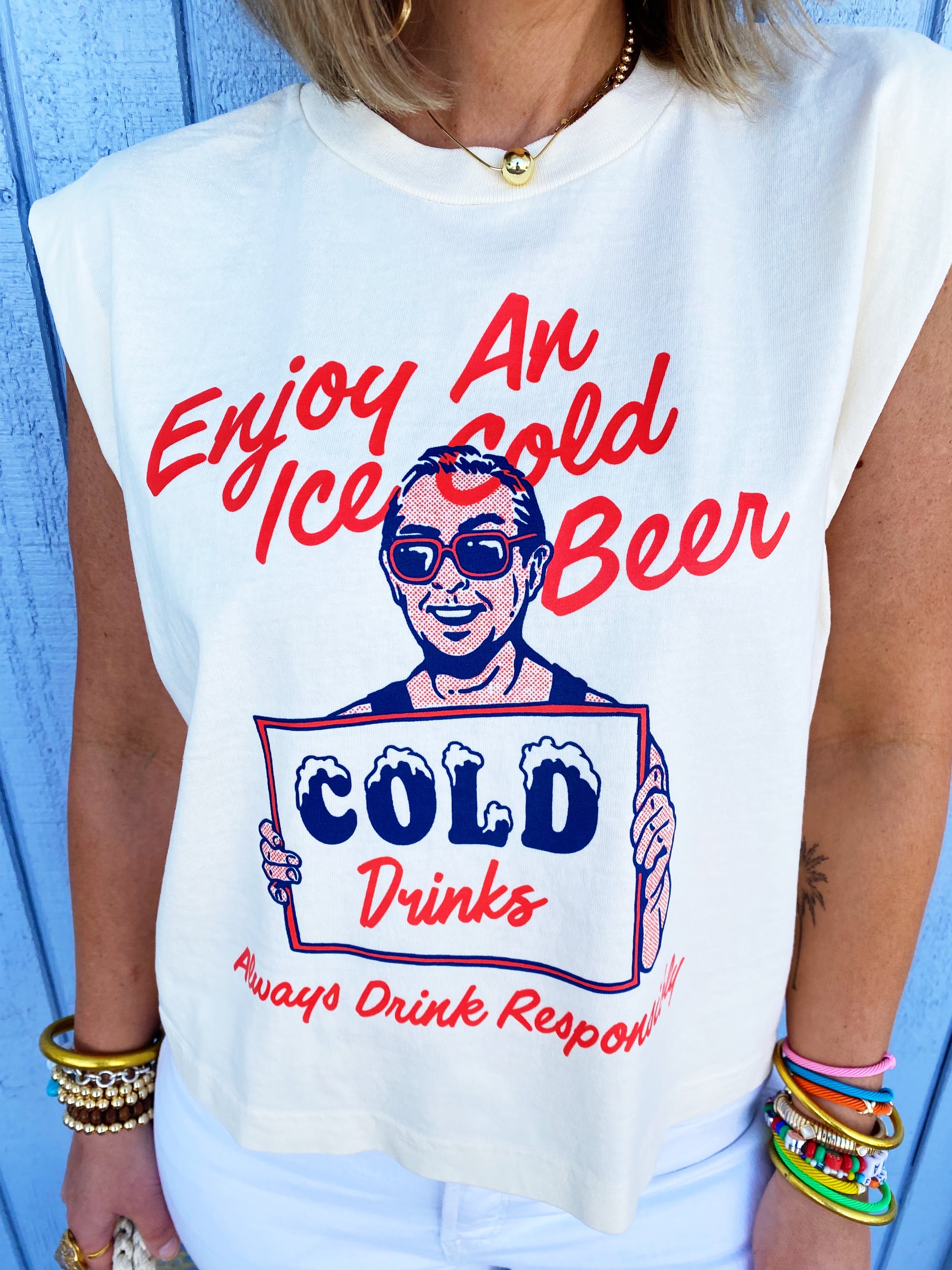 Get all of the summer-y vibes in our oversized retro inspired Enjoy An Iced Cold Beer cropped muscle tank!