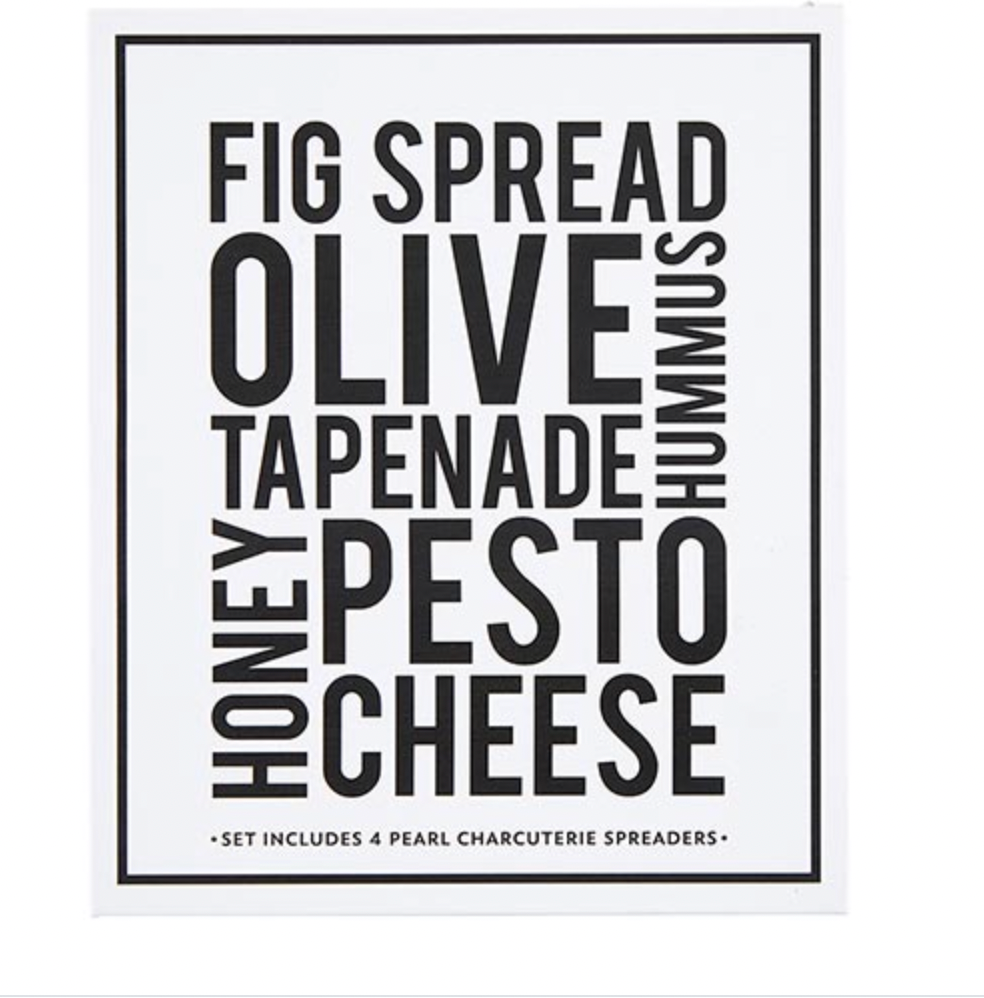 The perfect gift for a hostess! These pearl handled charcuterie spreaders come in a stylish cardboard book box.