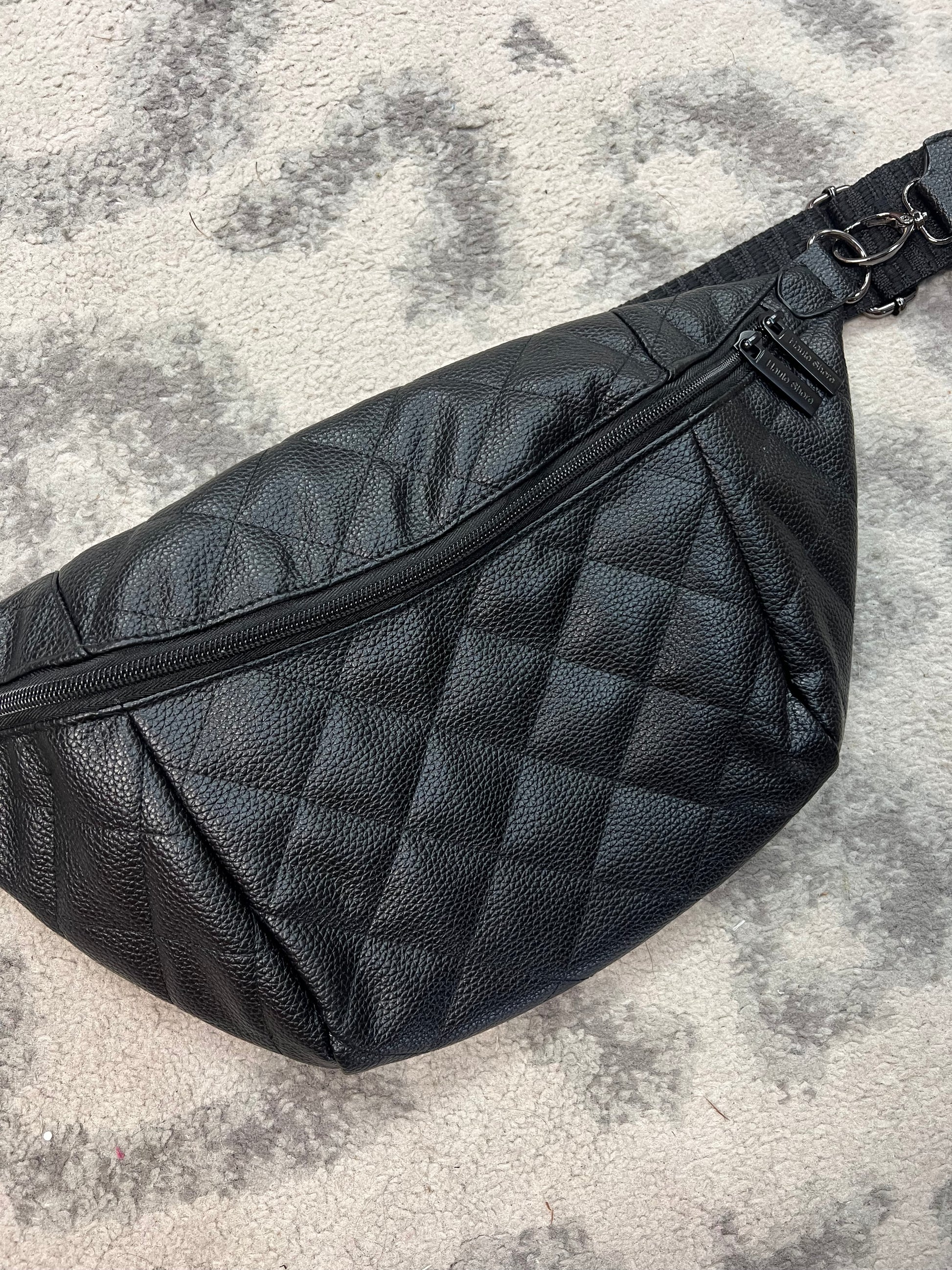 - Quilted vegan leather sling bag featuring top entry and additional back zip pocket. Sling strap adjustable to 40 inches.