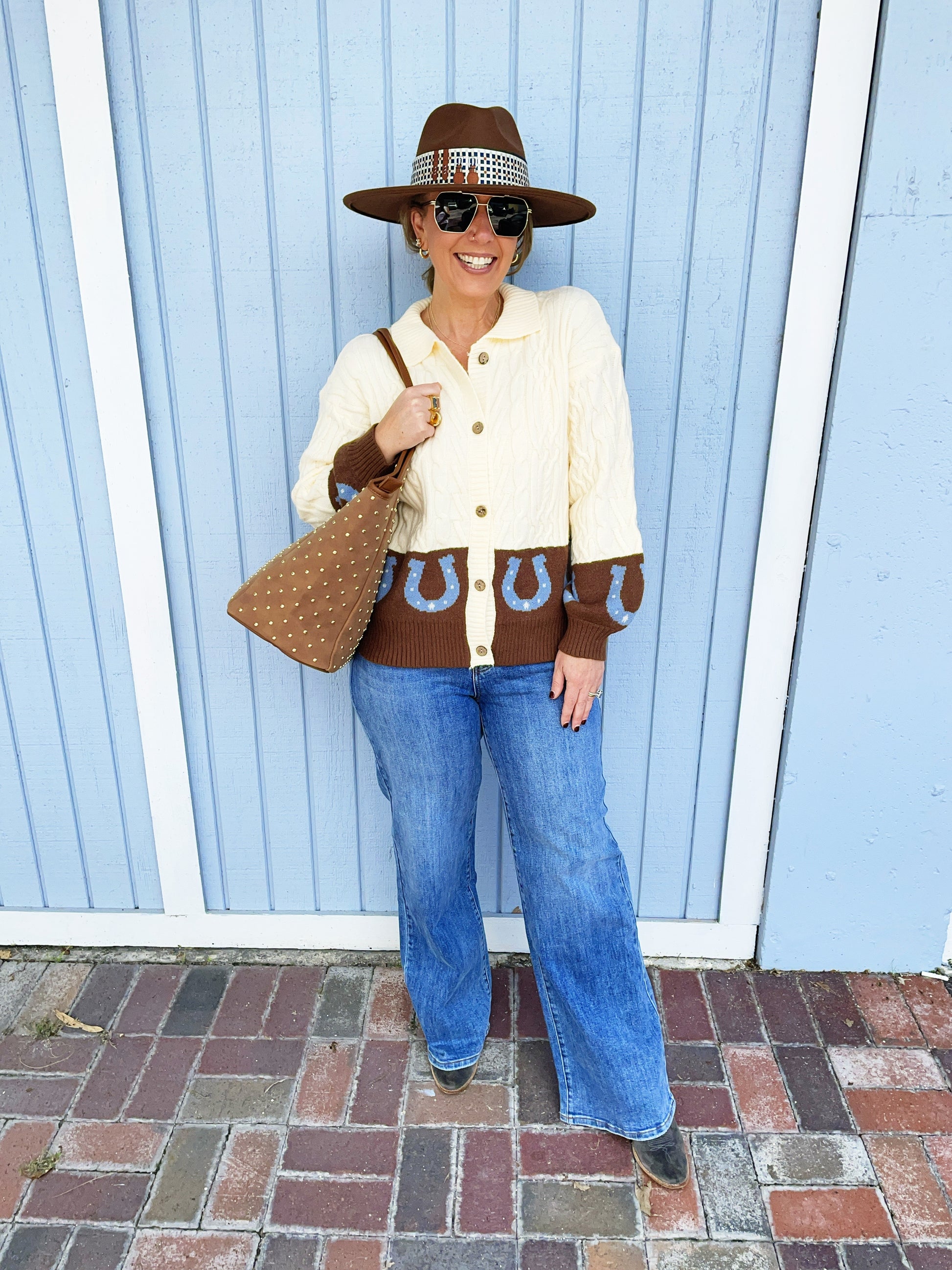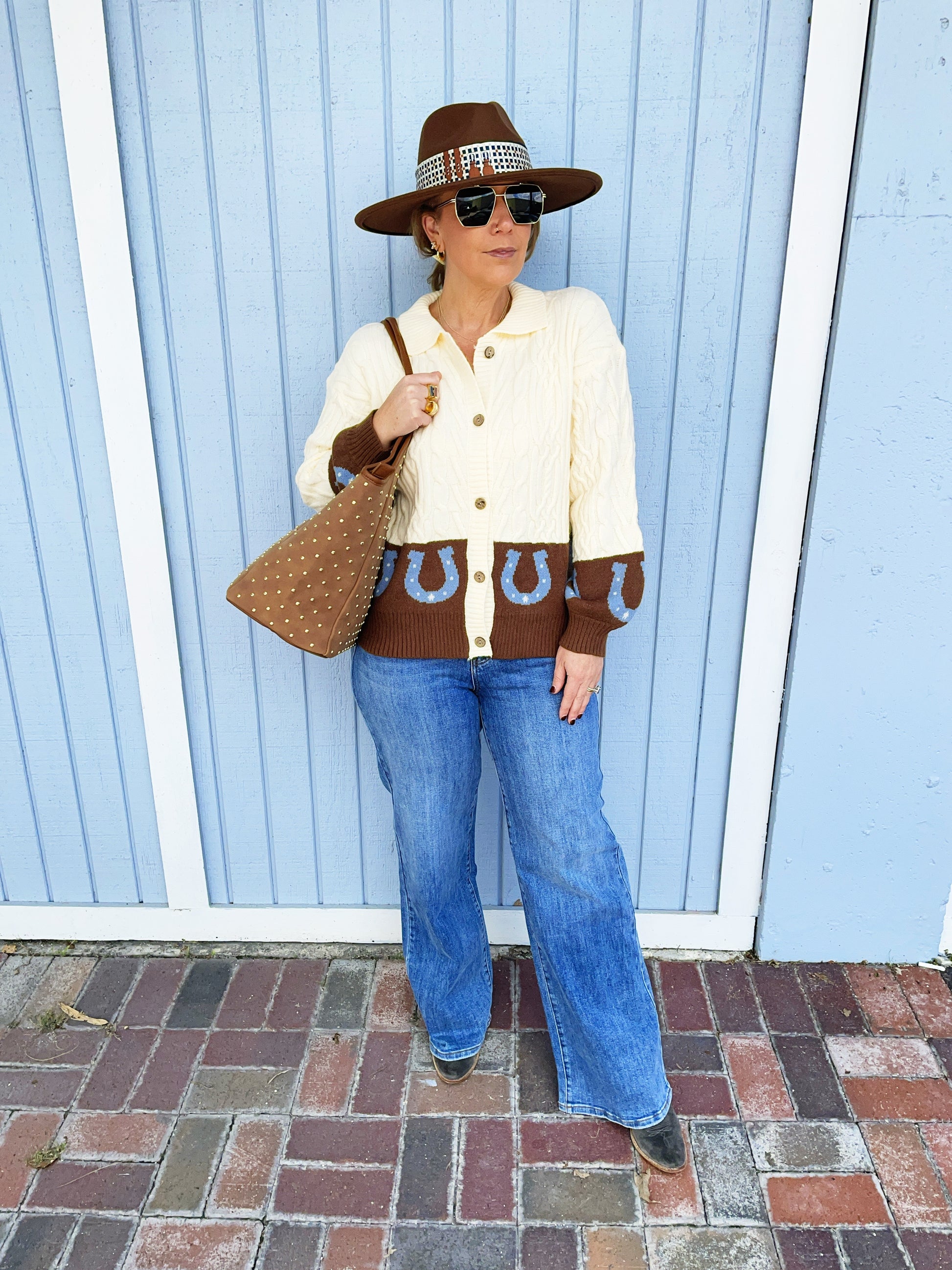 HORSESHOE CABLE COLOR BLOCK SWEATER CARDIGAN - CABLE TEXTURED KNIT - HORESHOE GRAPHIC PRINT - BUTTON DOWN FRONT - RELAXED FIT STYLE WITH SKIRT- ASK6507S