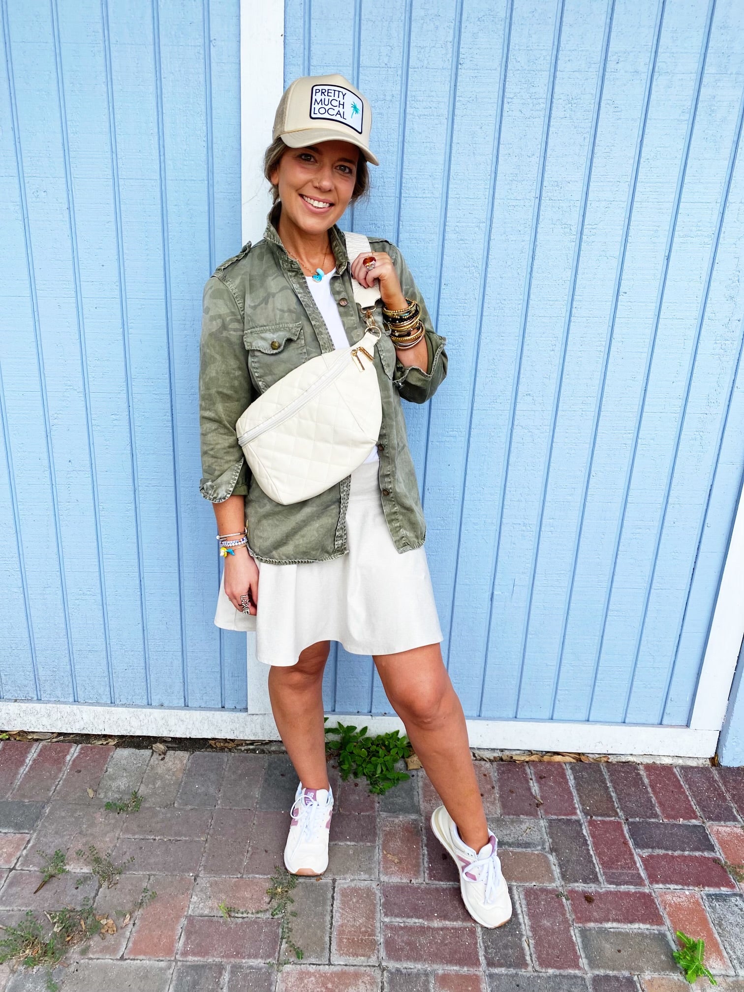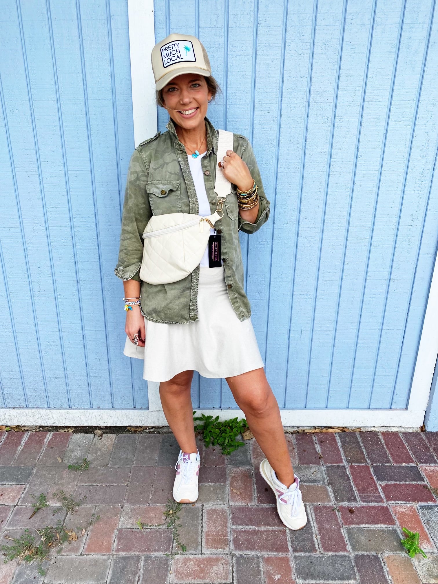 - Quilted vegan leather sling bag featuring top entry and additional back zip pocket. Sling strap adjustable to 40 inches.